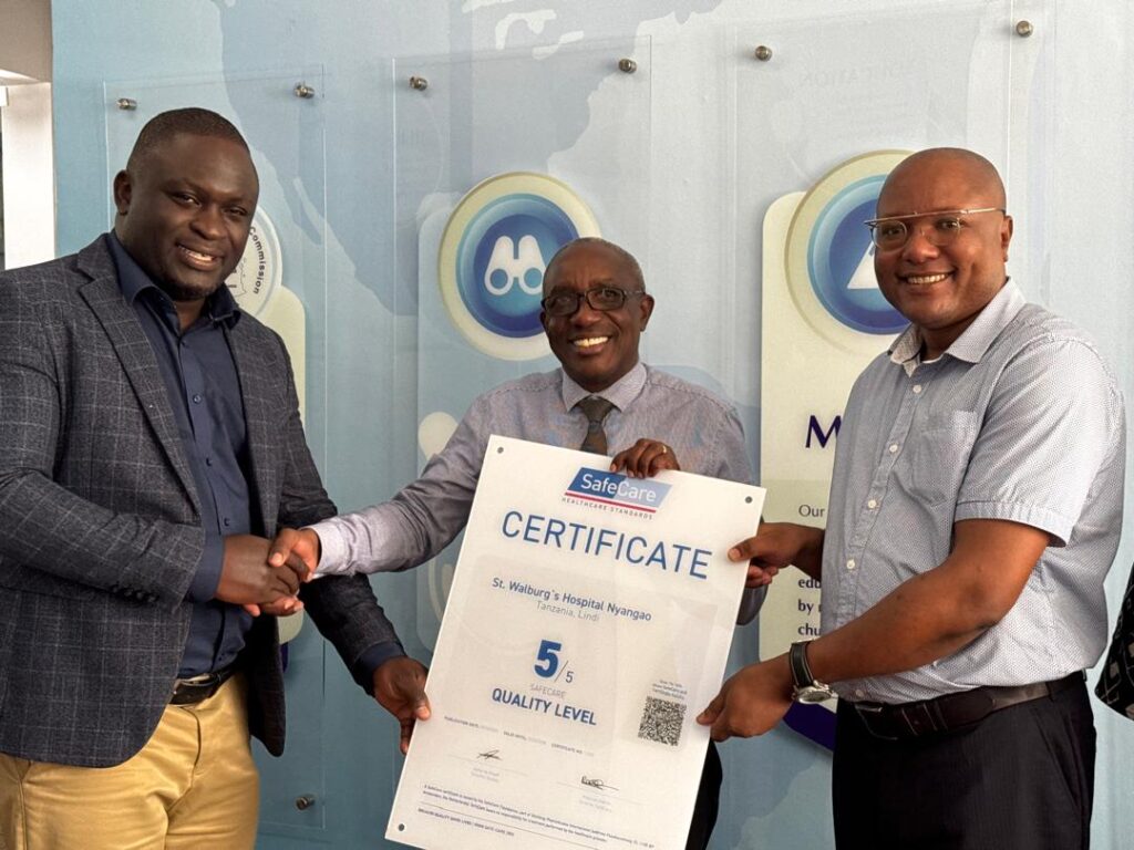 Hospital Board Chairperson Mr Peter Maziku Maduki (middle) together with Medical Officer Incharge Dr Masanja Erast Kasoga (on his right hand side) and Hospital Administrator Mr Hilary Donatus Mbando (left handside), holding a SafeCare certificate after being awarded on April 09.04.2026